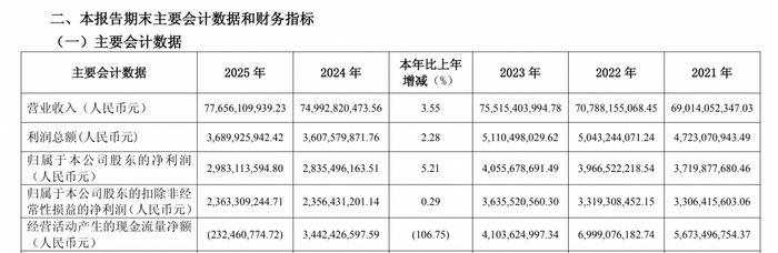 2025年,白云山实现营业收入776.56亿元,同比增长3.55%;归属于公司股东的净利润为29.83亿元,同比增长5.21%;归属于公司股东的扣除非经常性损益的净利润23.63亿元,同比增长0.29%。