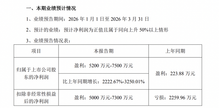 富祥药业预计2026年第一季度归属于上市公司股东的净利润5200万元-7500万元,比上年同期增长2222.67%-3250.01%;扣除非经常性损益后的净利润5000万元-7300万元,上年同期亏损2259.96万元。