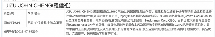 公开资料显示,程健祖,1960年出生,美国国籍,硕士学历。程健祖曾先后任百事可乐(Pepsi)美东区域技术运营总监、美国皇冠包装集团(CrownCork&Seal Inc)全球商务开发总裁、伟东包装(香港)集团有限公司总经理、HeckmmanCorp.CEO、百岁山意大利有限责任公司(GantenItalia Srl)创始总裁、每日食品欧洲委员会主席及国际数字经济创新组织(IECIA)执行董事等职务。
