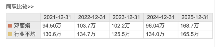 东方财富数据显示,2021年至2025年,邓丽娟薪酬分别为94.50万元、103.7万元、102.2万元、96.04万元、168.7万元。其中,2025年薪酬同比增长75.66%。