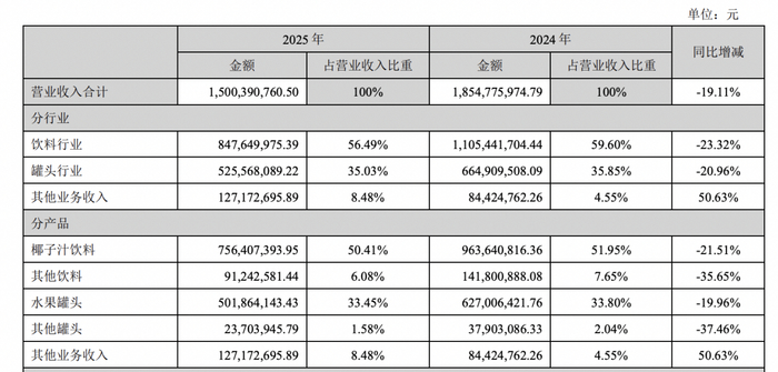 分产来看,报告期内,欢乐家椰子汁饮料营收约7.56亿元,同比减少21.51%;其他饮料营收约0.91亿元,同比减少35.65%;水果罐头营收约5.02亿元,同比减少19.96%;其他罐头营收约0.24亿元,同比减少37.46%。