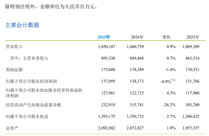 2025年,中国移动营业收入1.05万亿元,同比增长0.9%;归属于母公司股东的净利润为1370.95亿元,同比下降0.9%;归属于母公司股东的扣除非经常性损益的净利润1279.61亿元,同比增长4.3%。