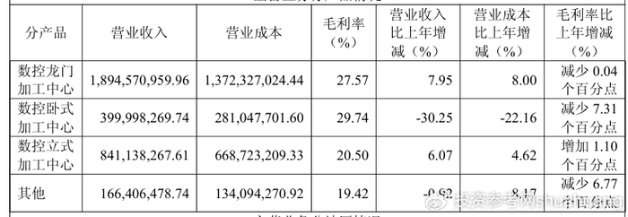 与此同时,数控龙门加工中心和数控立式加工中心因为下游市场需求增加,销售收入有所增长。但即便如此,龙门加工中心的毛利率也有0.04个百分点的微跌。