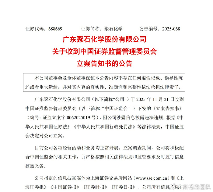 2025年11月21日晚间,广东聚石化学股份有限公司(公司或聚石化学)披露,收到中国证监会下发的《立案告知书》。