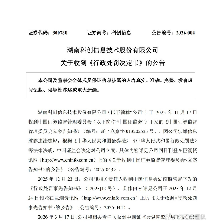 2026年3月18日,湖南科创信息技术股份有限公司(公司或科创信息)披露,收到中国证监会湖南监管局下发的《行政处罚决定书》。