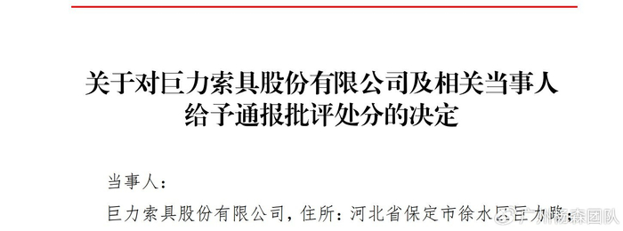 交易所决定对巨力索具股份有限公司及相关当事人给予通报批评的处分。
