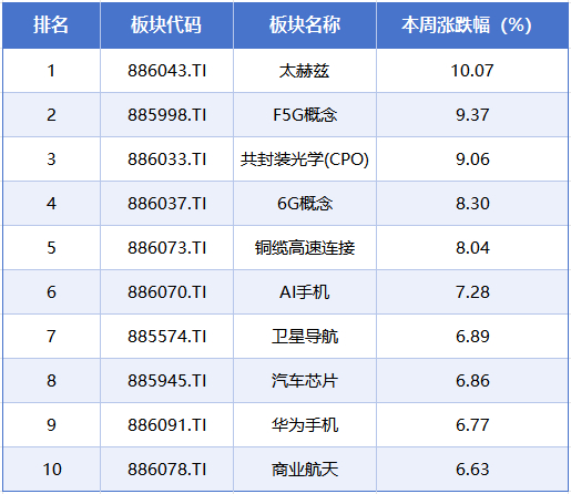 板块方面,本周涨幅居前的概念板块分别是太赫兹、F5G、共封装光学(CPO)、6G概念、铜缆高速连接,累计涨幅分别为10.07%、9.37%、9.06%、8.30%、8.04%。
