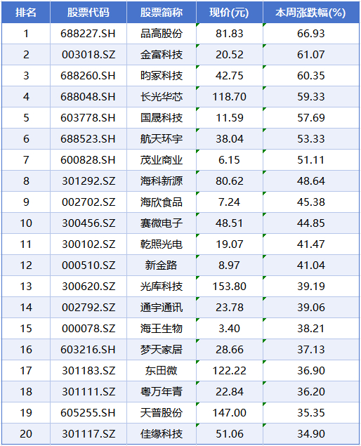 个股方面,本周个股涨幅榜前五位分别是品高股份、金富科技、昀冢科技、长光华芯、国昇科技,累计涨幅分别为66.93%、61.07%、60.35%、59.33%、57.69%。
