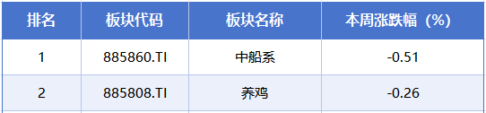 本周排在跌幅榜前排的概念板块分别是中船系、养鸡,累计跌幅分别为0.51%、0.26%。除上述两个板块外,其他概念板块本周均迎来反弹。