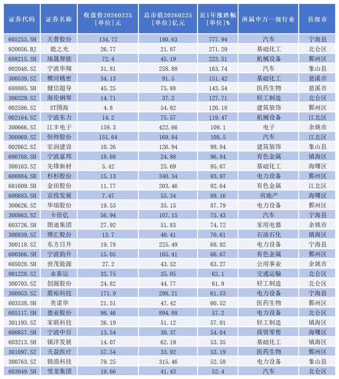 同花顺数据显示,截至2月25日收盘,宁波一共有125家上市公司。从二级市场表现看,近一年,一共有97家公司股价出现上涨。