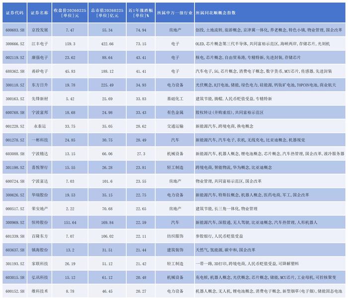 从2026年以来表现看,京投发展(600683.SH)、江丰电子(300666.SZ)、康强电子(002119.SZ)、甬矽电子(688362.SH)、东方日升(300118.SZ)、宁波精达(603088.SH)、喜悦智行(301198.SZ)等20家公司涨幅超过20%。