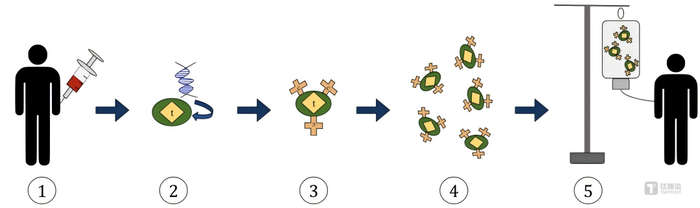 路径:从患者血液内分离T细胞(标识为T)—为T细胞引入具有嵌合抗原受体(标识为C)编码的基因—经过改造的T细胞现以可对特定的抗原做出反应—在组织培养中扩增经过改造的T细胞—为患者输入增经过改造的T细胞;图源:维基百科