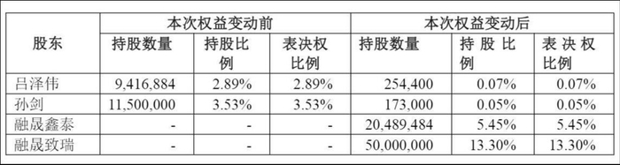 1月15日,天晟新材公告,融晟鑫泰以6.39元/股受让孙剑、吕泽伟合计2048.95万股股份;同时,公司拟向融晟致瑞发行5,000万股股票。交易完成后,融晟鑫泰为融晟致瑞的一致行动人,二者合计持股达18.75%,融晟致瑞成为公司控股股东,尉立东成为公司实控人。