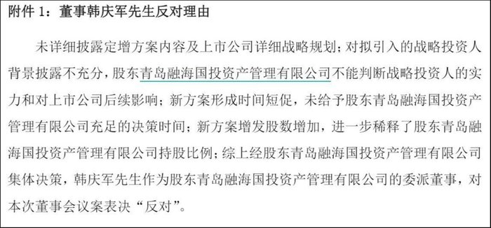 韩庆军系股东青岛融海国投资产管理有限公司(以下简称“融海资产”)委派董事,其反对理由明确指向本次定增方案的多重隐患:一是未充分披露战投背景及其实力,融海资产无法判断其对上市公司未来发展的实际影响;二是定增方案缺乏清晰的长期战略规划;三是新方案形成时间短促,未给予融海资产充足的决策时间;四是新增股份将进一步稀释融海资产的持股比例。