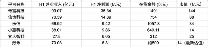 再比如, 宜人智科上半年的净利润(6.05 亿)略低于数禾(6.31 亿),且其在贷余额(312 亿)仅为数禾(约 500 亿)的六成左右。然而,宜人智科的市值却达到了 25 亿元,比数禾的成交估值高出近八成。