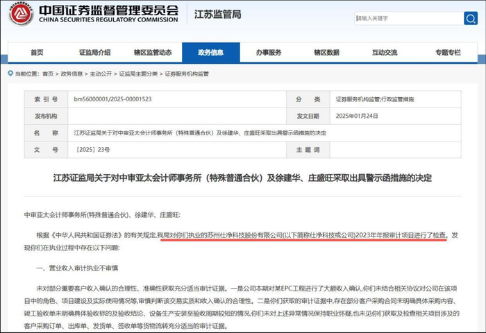 中国证监会江苏监管局网站显示,2025年1月,江苏证监局对中审亚太及签字注册会计师徐建华、庄盛旺出具警示函,原因系中审亚太执业的仕净科技2023年年报审计项目存在多项审计违规,包括营业收入审计执业不审慎,未对部分重要客户收入确认的合理性、准确性获取充分适当审计证据;预付账款审计程序存在缺陷,未对函证异常情况、大额预付款的合理性等保持职业怀疑。
