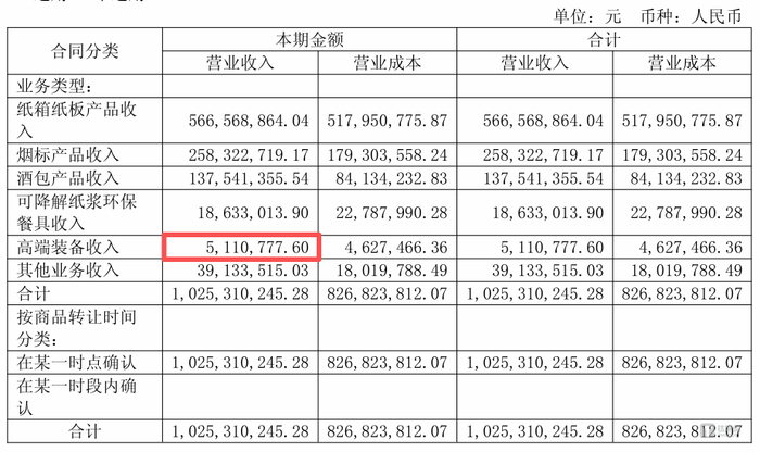 2025年半年报显示,公司高端装备板块营收相比核心业务纸箱纸板产品业务收入,几乎可以忽略。