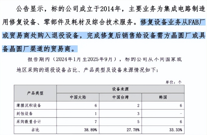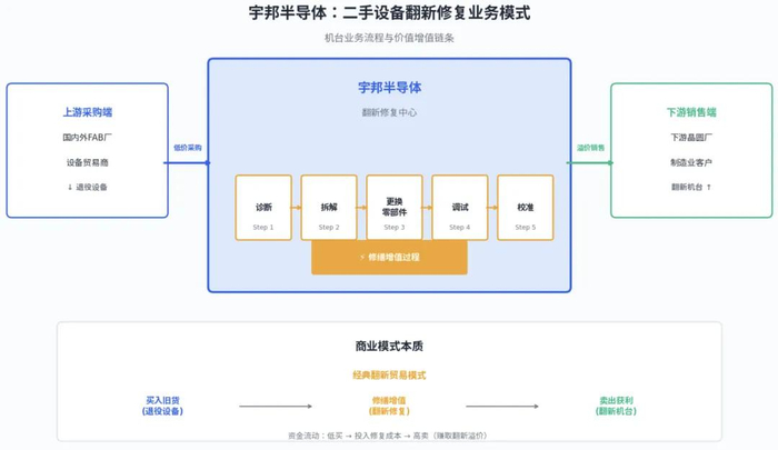 对于宇邦半导体的核心业务——“集成电路晶圆制造核心前道修复装备”,如果剥掉关于其运营模式的专业包装,这门生意的核心动作通俗来讲就是:回收大厂退下来的半导体设备,对其翻新后转售。
