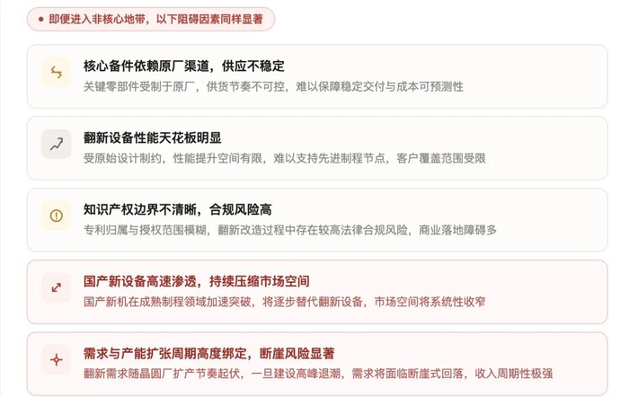 据其介绍,半导体设备翻新还存在一个核心制约在于“联调”难度。二手设备入厂后须重新调试标定,下游晶圆厂不可能以翻新设备为产线主力,只能局部偶发使用。翻新设备始终向下兼容成熟制程,无法向上侵蚀先进节点。