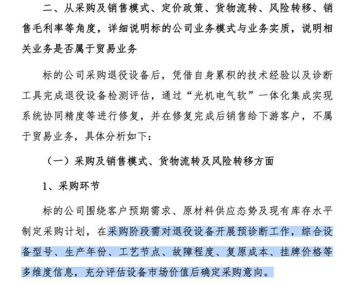 康欣新材披露内容截图宇邦半导体的二手设备翻新修复表现为机台业务,从资金流动角度看,这与“买入旧货、修缮增值、卖出”的经典翻新贸易并无实质差异。公司自身亦承认,采购时须对退役设备进行“预诊断”,以评估其“市场价值”——这是典型的贸易采购逻辑,而非制造业的原材料入库逻辑。