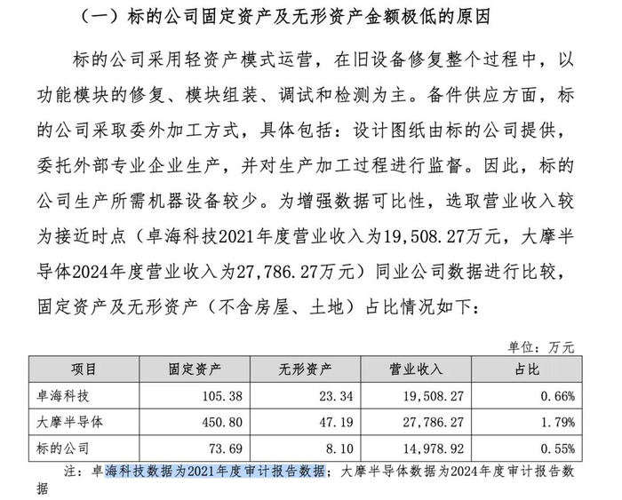 对此种“固定资产及无形资产金额极低”状态, 康欣新材援引卓海科技试图证明“符合行业惯例”,其采用的方法却是以后者2021年数据(固定资产105万,无形资产23万)作为参照对比自身当前状况。