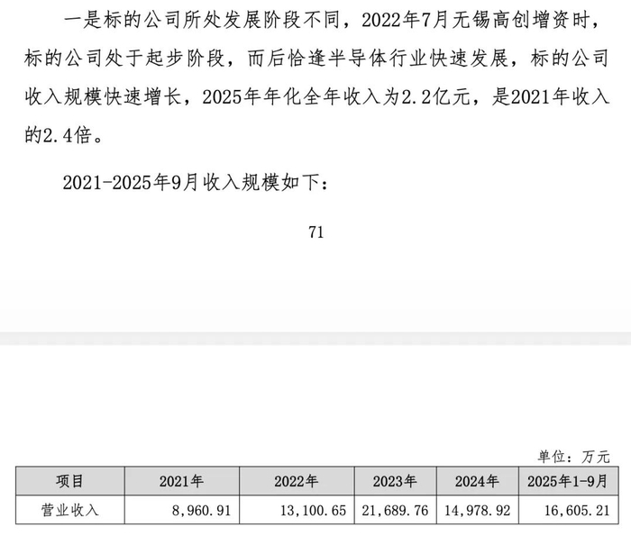 康欣新材的相关披露称,“2022年7月无锡高创增资时,标的公司(宇邦半导体)处于起步阶段,而后恰逢半导体行业快速发展,收入规模快速增长….”