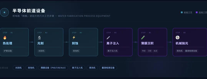 半导体设备主要分三大类:前道(制造)、后道(封测)、其他支撑设备。