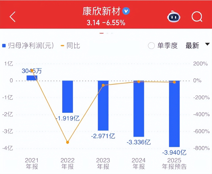 实际财务数据的惨烈程度远超言语上的轻描淡写。康欣新材从2021年归母净利润3045万元,跌入逐年扩大的亏损深渊:2022至2025年,四年累计亏损超过12亿元。