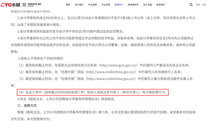 但记者发现,在ST长园官网发布的《长园科技集团股份有限公司2025年财务报表和内部控制审计项目-采购招标公告》中,明确要求投标人不得存在“近三年内(投标截止时间向前追溯三年)投标人或其法定代表人(单位负责人)有行贿犯罪行为”的情况。