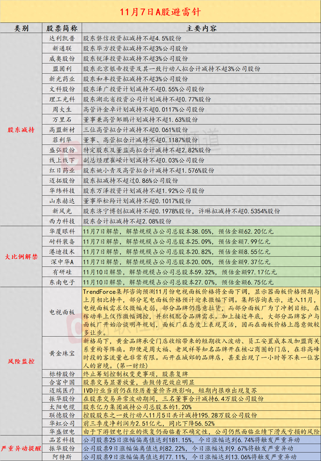 导读:财联社11月7日投资避雷针,近日,A股及海外市场潜在风险事件如下。国内经济信息方面包括:1)集邦咨询预测11月电视面板价格将全面下调;2)一小时等不来一位客人,黄金品牌承受阵痛;公司方面重点关注包括:1)标榜股份终止筹划控制权变更事项,股票复牌;2)8连板合富中国公告,股票交易显著放量,击鼓传花效应明显;海外市场重点关注包括:1)美股三大指数集体收跌,纳指跌近2%;2)美联储哈玛克表示,并不希望将利率下调至宽松区间。
