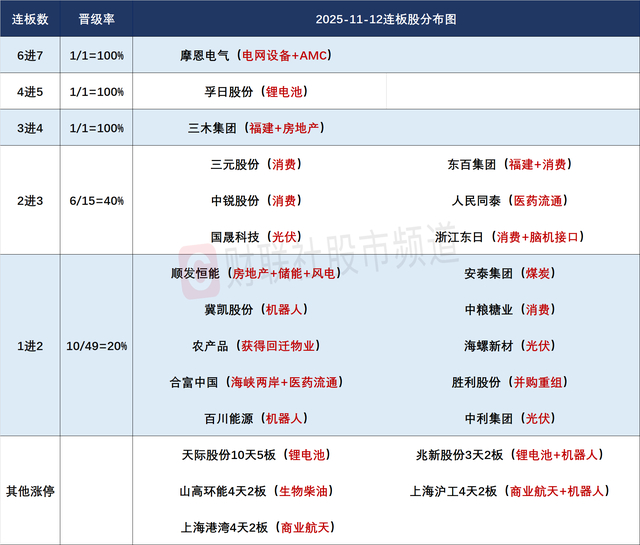 财联社11月12日讯,今日57股涨停,19股炸板,封板率为75%,摩恩电气7连板,孚日股份5连板,三木集团8天5板,东百集团6天4板,人民同泰、三元股份、浙江东日、国晟科技、中锐股份3连板,合富中国12天11板,安泰集团20天11板。市场探底回升,沪指微跌,创业板指尾盘一度翻红。沪深两市成交额1.95万亿,较上一个交易日缩量486亿。盘面上,市场热点快速轮动,全市场超3500只个股下跌。板块方面,保险、医药、油气等板块涨幅居前,培育钻石、光伏、可控核聚变等板块跌幅居前。截至收盘,沪指跌0.07%,深成指跌0.36%,创业板指跌0.39%。