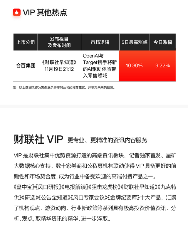 注:财联社VIP为内容资讯产品,并非投资建议。以下内容仅为资讯价值展示非对相关公司的推荐建议,非未来走势预测。投资有风险,入市需谨慎。
