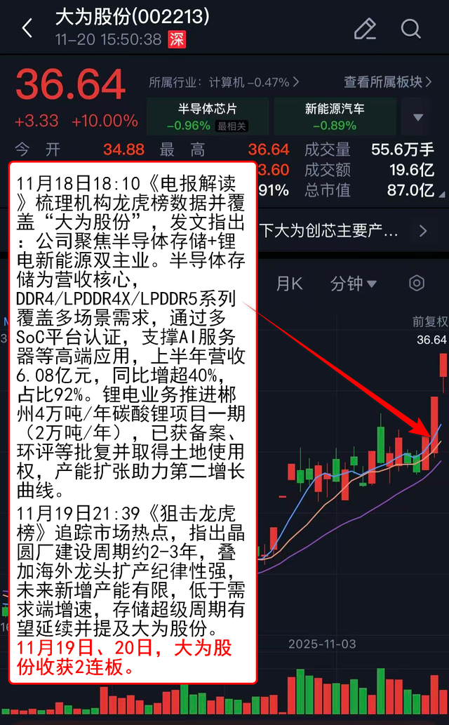 11月18日18:10《电报解读》 梳理机构龙虎榜数据并覆盖“大为股份”,发文指出:公司聚焦半导体存储+锂电新能源双主业。半导体存储为营收核心,DDR4/LPDDR4X/LPDDR5系列覆盖多场景需求,通过多SoC平台认证,支撑AI服务器等高端应用,上半年营收6.08亿元,同比增超40%,占比92%。锂电业务推进郴州4万吨/年碳酸锂项目一期(2万吨/年),已获备案、环评等批复并取得土地使用权,产能扩张助力第二增长曲线。
