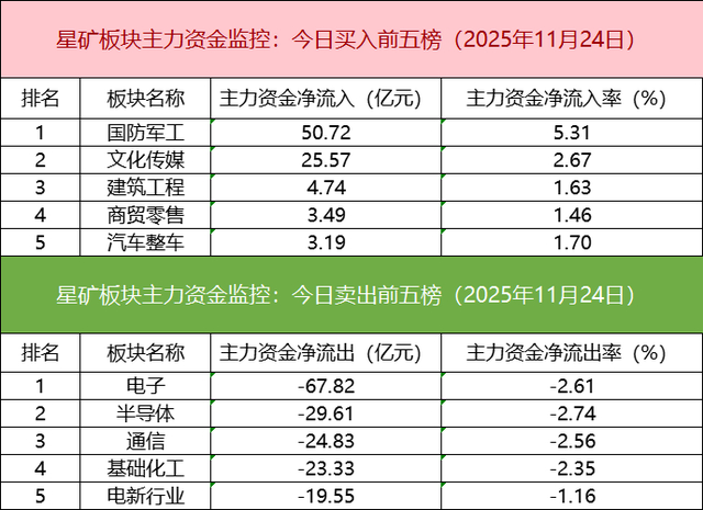 从主力板块资金监控数据来看,国防军工板块主力资金净流入居首。