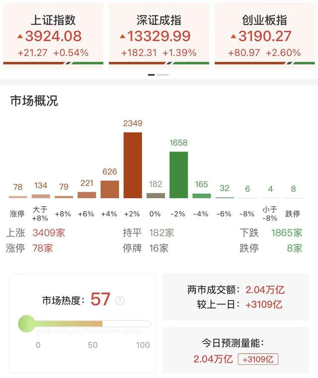 财联社12月8日讯,市场高开高走,深成指涨超1%,创业板指涨超2%。沪深两市成交额2.04万亿,较上一个交易日放量3109亿,时隔20个交易日两市成交额再度突破2万亿元。盘面上,市场热点快速轮动,全市场超3400只个股上涨。从板块来看,福建板块再度爆发,安记食品5连板,舒华体育、福建金森等10余股涨停。算力硬件概念走强,天孚通信触及20cm涨停创新高。商业航天概念延续强势,顺灏股份7天6板,龙洲股份4连板。下跌方面,煤炭板块表现疲软,安泰集团、陕西黑猫下挫。截至收盘,沪指涨0.54%,深成指涨1.39%,创业板指涨2.6%。