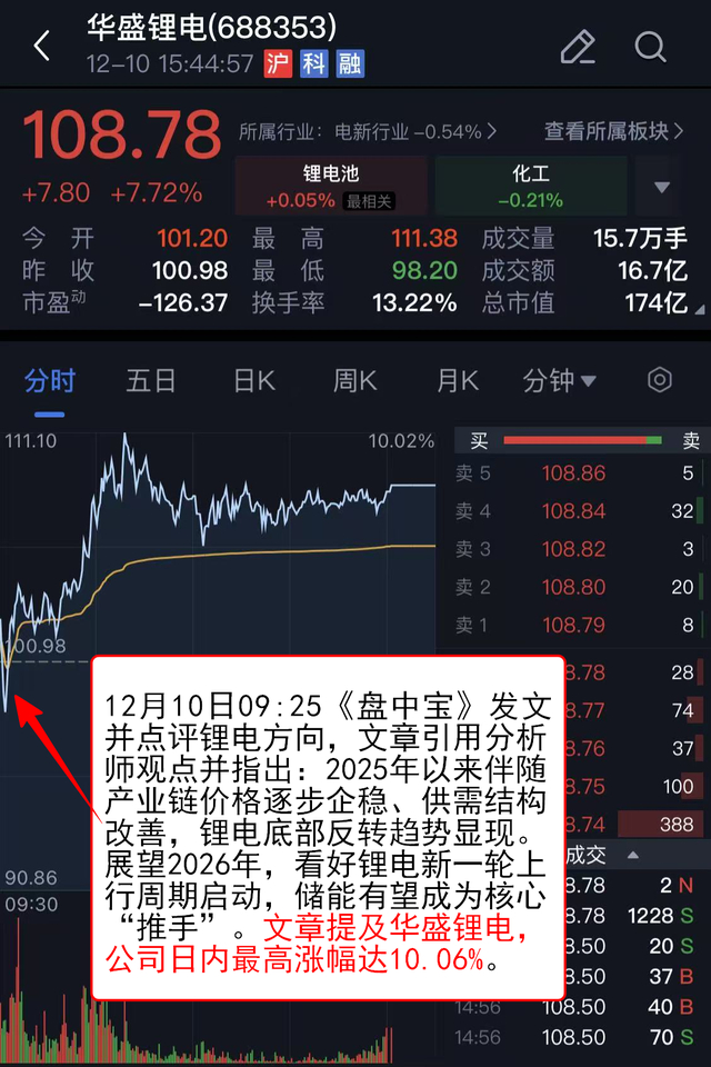 12月10日09:25《盘中宝》 发文并点评锂电方向,文章引用分析师观点并指出:2025年以来伴随产业链价格逐步企稳、供需结构改善,锂电底部反转趋势显现。展望2026年,看好锂电新一轮上行周期启动,储能有望成为核心“推手”。文章提及华盛锂电,公司日内最高涨幅达10.06%。