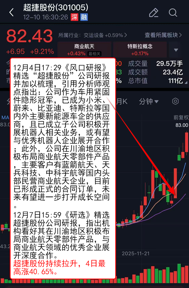 12月4日17:29《风口研报》 精选“超捷股份”公司研报并加以梳理,引用分析师观点指出:公司作为车用紧固件隐形冠军,已成为小米、蔚来、比亚迪、特斯拉等国内外主要新能源车企的供应商,且已成立子公司积极开展机器人相关业务,或有望与优秀机器人企业展开合作;此外,公司在川渝地区积极布局商业航天零部件产品,主要客户有蓝箭航天、天兵科技、中科宇航等国内头部民营商业航天企业,目前已形成正式的合同订单,未来有望进一步打开成长空间。