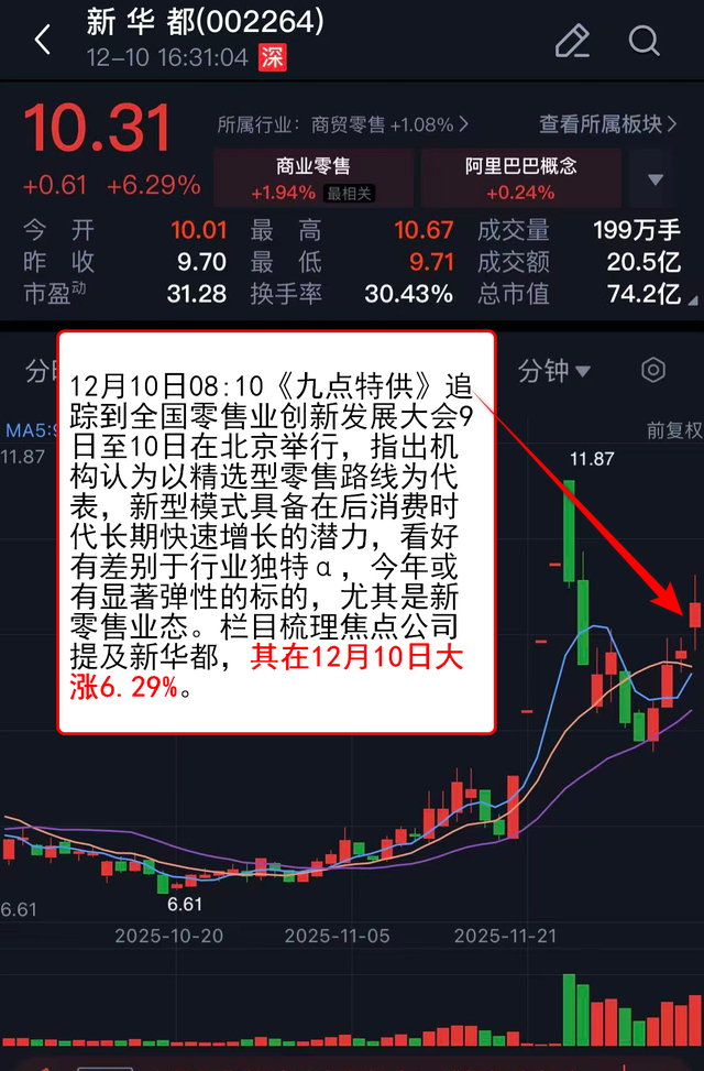 12月10日08:10《九点特供》 追踪到全国零售业创新发展大会9日至10日在北京举行,指出机构认为以精选型零售路线为代表,新型模式具备在后消费时代长期快速增长的潜力,看好有差别于行业独特α,今年或有显著弹性的标的,尤其是新零售业态。栏目梳理焦点公司提及新华都,其在12月10日大涨6.29%。