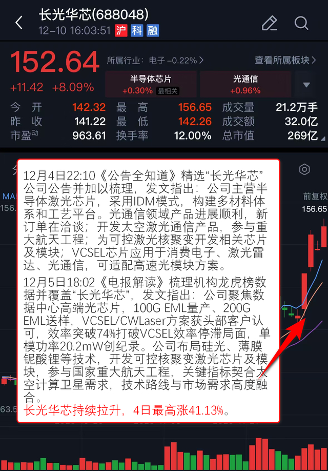 12月4日22:10《公告全知道》 精选“长光华芯”公司公告并加以梳理,发文指出:公司主营半导体激光芯片,采用IDM模式,构建多材料体系和工艺平台。光通信领域产品进展顺利,新订单在洽谈;开发太空激光通信产品,参与重大航天工程;为可控激光核聚变开发相关芯片及模块;VCSEL芯片应用于消费电子、激光雷达、光通信,可适配高速光模块方案。