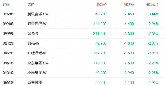 截至收盘,腾讯音乐-SW(01698.HK)跌3.44%、阿里巴巴-W(09988.HK)跌2.96%、网易-S(09999.HK)跌2.37%。