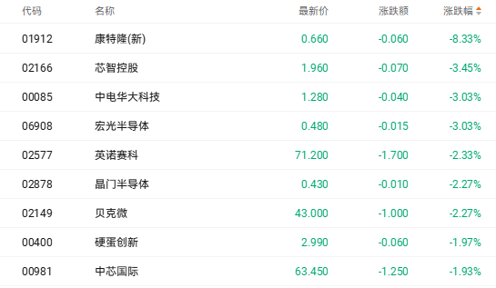 半导体股同样表现不佳,中电华大科技(00085.HK)跌3.03%、宏光半导体(06908.HK)跌3.03%、英诺赛科(02577.HK)跌2.33%。