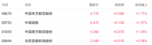 与多数板块不同,航空股今日表现强势。截至收盘,中国东方航空股份(00670.HK)涨1.71%、中国国航(00753.HK)涨1.257%、中国南方航空(01055.HK)涨1.35%。