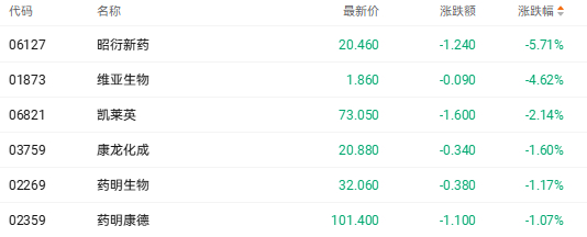 截至收盘,昭衍新药(06127.HK)跌5.71%、维亚生物(01873.HK)跌4.62%、药明生物(02269.HK)跌1.17%。