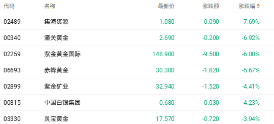 截至收盘,潼关黄金(00340.HK)跌6.92%、紫金黄金国际(02259.HK)跌6%、赤峰黄金(06693.HK)跌5.67%。