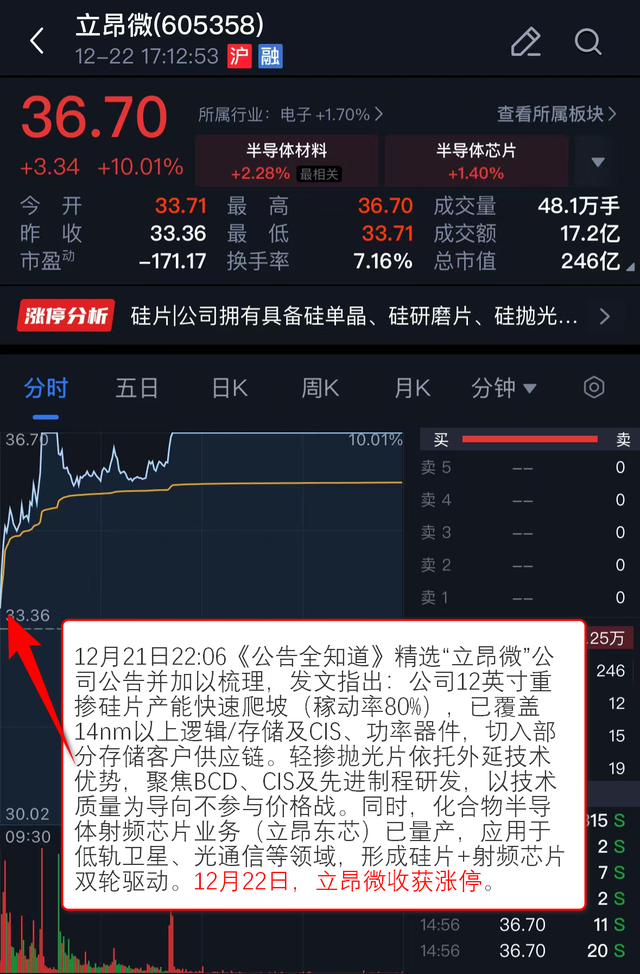 12月21日22:06《公告全知道》 精选“立昂微”公司公告并加以梳理,发文指出:公司12英寸重掺硅片产能快速爬坡(稼动率80%),已覆盖14nm以上逻辑/存储及CIS、功率器件,切入部分存储客户供应链。轻掺抛光片依托外延技术优势,聚焦BCD、CIS及先进制程研发,以技术质量为导向不参与价格战。同时,化合物半导体射频芯片业务(立昂东芯)已量产,应用于低轨卫星、光通信等领域,形成硅片+射频芯片双轮驱动。12月22日,立昂微收获涨停。