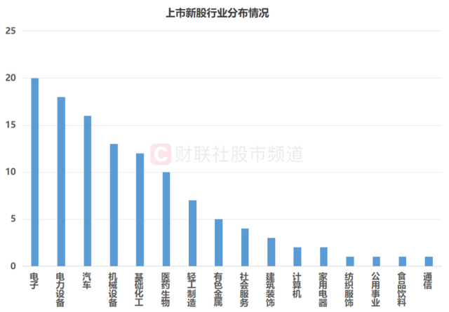 按行业板块来看,上市的新股中,电子股数量最多,占比高达17.2%,电力设备、汽车、机械设备、基础化工股占比也均超10%,同时还涵盖医药生物、轻工制造、有色金属、社会服务、建筑装饰、计算机、家用电器、纺织服饰、公用事业、食品饮料、通信股。若以证券板块统计,主板股、创业板、北交所、科创板分别占比32.8%、28.4%、22.4%、16.4%。