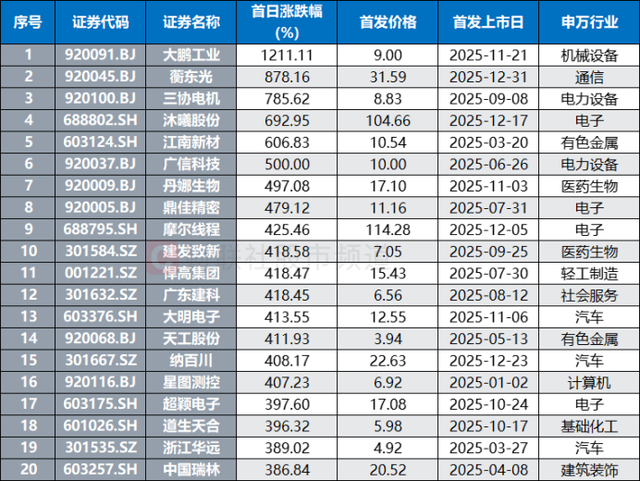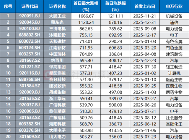 若以首日最大涨幅统计,2025年上市新股中,大鹏工业、蘅东光2股首日涨幅一度超10倍,其均为北交所新股。此外,三协电机、沐曦股份、天和磁材、江南新材、中国瑞林、纳百川、悍高集团、星图测控、赛分科技、建发致新、丹娜生物、浙江华远、广信科技、鼎佳精密等共19股首日最大涨幅也均在5倍以上。