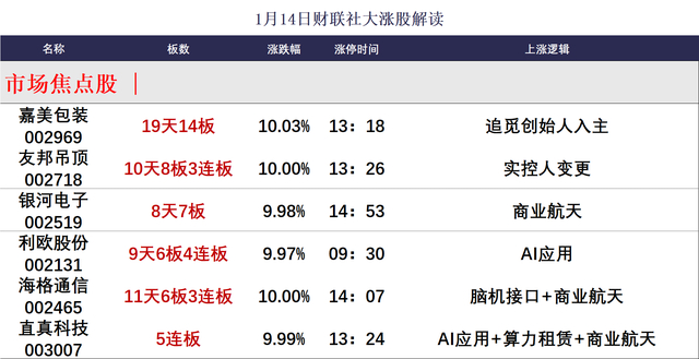 财联社1月14日讯,今日102股涨停,59股炸板,封板率为63%,直真科技5连板,三维通信、省广集团、美年健康4连板,嘉美包装19天14板,友邦吊顶10天8板,银河电子8天7板,利欧股份9天6板,海格通信11天6板,北交所流金科技30cm3天2板,北交所七丰精工、美登科技30cm首板。市场冲高回落,沪指午后快速翻绿,此前一度涨超1%。沪深两市成交额3.94万亿,较上一个交易日放量2904亿,连续第3个交易日突破3.5万亿。盘面上,市场热点快速轮动,全市场超2700只个股上涨。板块方面,AI应用、商业航天、半导体、算力租赁板块领涨,保险、银行、锂电池等板块领跌。截至收盘,沪指跌0.31%,深成指涨0.56%,创业板指涨0.82%。