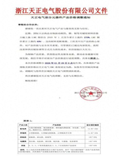 成本压力之下,部分企业已开始调整产品售价。天正电气(605066.SH)近日向部分客户群发布通知,宣布自1月29日起,对断路器、工控及中压产品中涉及铜、银等关键原材料的部分型号进行适度提价,涨幅在3%至50%之间。有经销商告诉财联社记者,该公司29日确已调价,多数产品涨幅30%左右。
