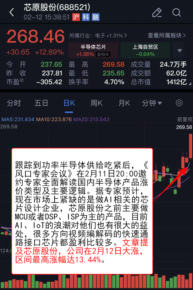 跟踪到功率半导体供给吃紧后,《风口专家会议》在2月11日20:00邀约专家全面解读国内半导体产品涨价类型及主要逻辑。据专家预计,现在市场上紧缺的是做AI相关的芯片设计企业,芯原股份之前主要做MCU或者DSP、ISP为主的产品,目前AI、IoT的浪潮对他们也有很大的益处,很多方向视频编解码的快速通路接口芯片都盈利比较多。文章提及芯原股份,公司在2月12日大涨,区间最高涨幅达13.44%。